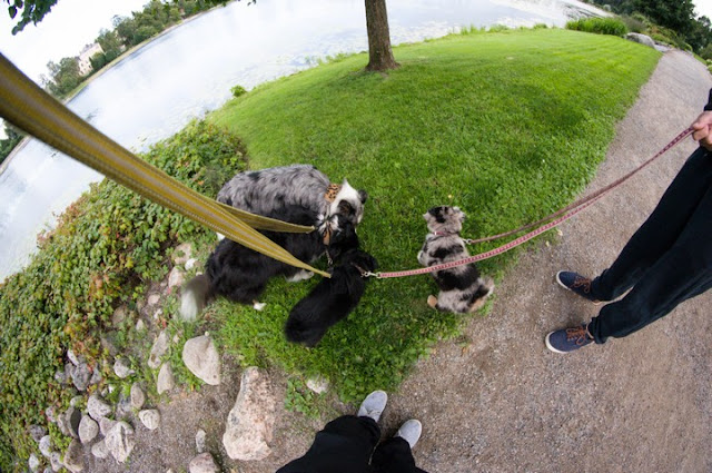 Kurvattiin kohti KEK:sta pentutarkastukseen naperoiden täytettyä tasan seittemän viikkoa. Ipanat kävelivät ihan itte hihnassa reippaasti ellään mamman perässä. Saatiinkin heti kommenttia että "ei meidän pennut vielä seittemän viikkosena tolleen hihnassa..." Hehe.